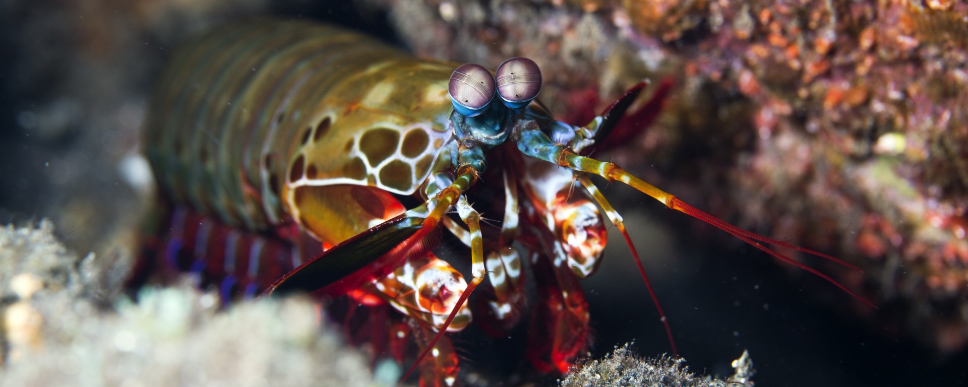 The brightly colored mantis shrimp is known for powerful arms that protrude from beneath its head and have the ability to rapidly punch and break hard surfaces, from seashells to aquarium glass. The unique physiology of the mantis shrimp’s eyes enables the animal to see parts of the ultraviolet spectrum that are not visible to humans. Whereas humans have only three types of color receptors, mantis shrimp have twelve, Cronin’s research reveals.