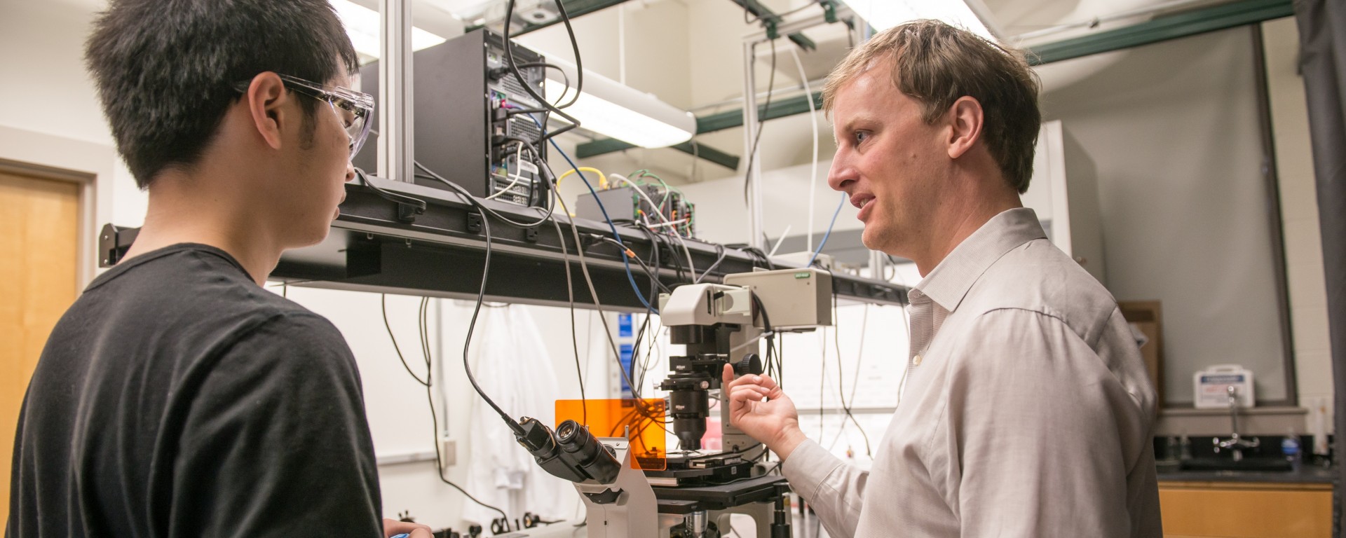 Matt Pelton works with a student in his lab. Photo by Marlayna Demond ’11 for UMBC.