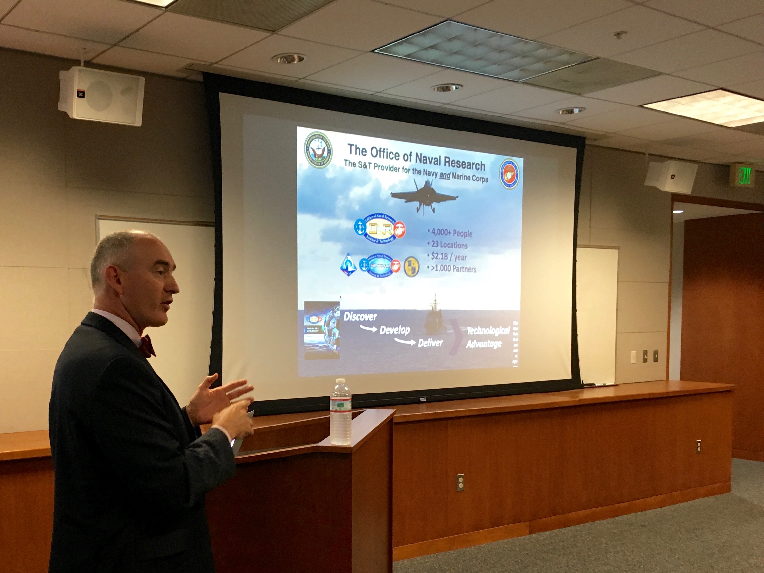 Last Thursday, May 12th, Dr. Larry Schuette, the Director of Research at the Navy's Office of Naval Research (ONR), spoke to over 40 UMBC professors about how best to navigate opportunities for collaboration and extramural funding from ONR.
