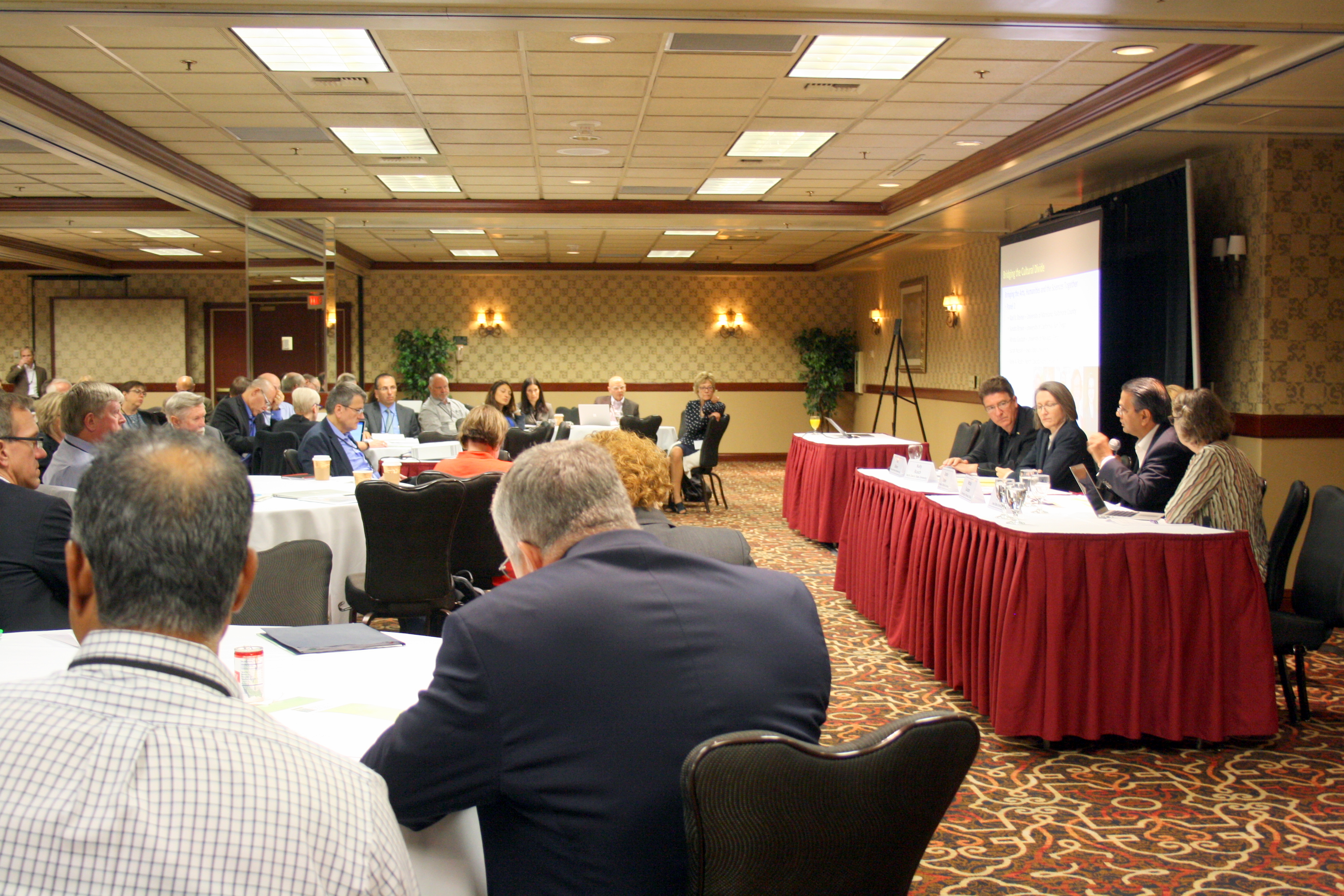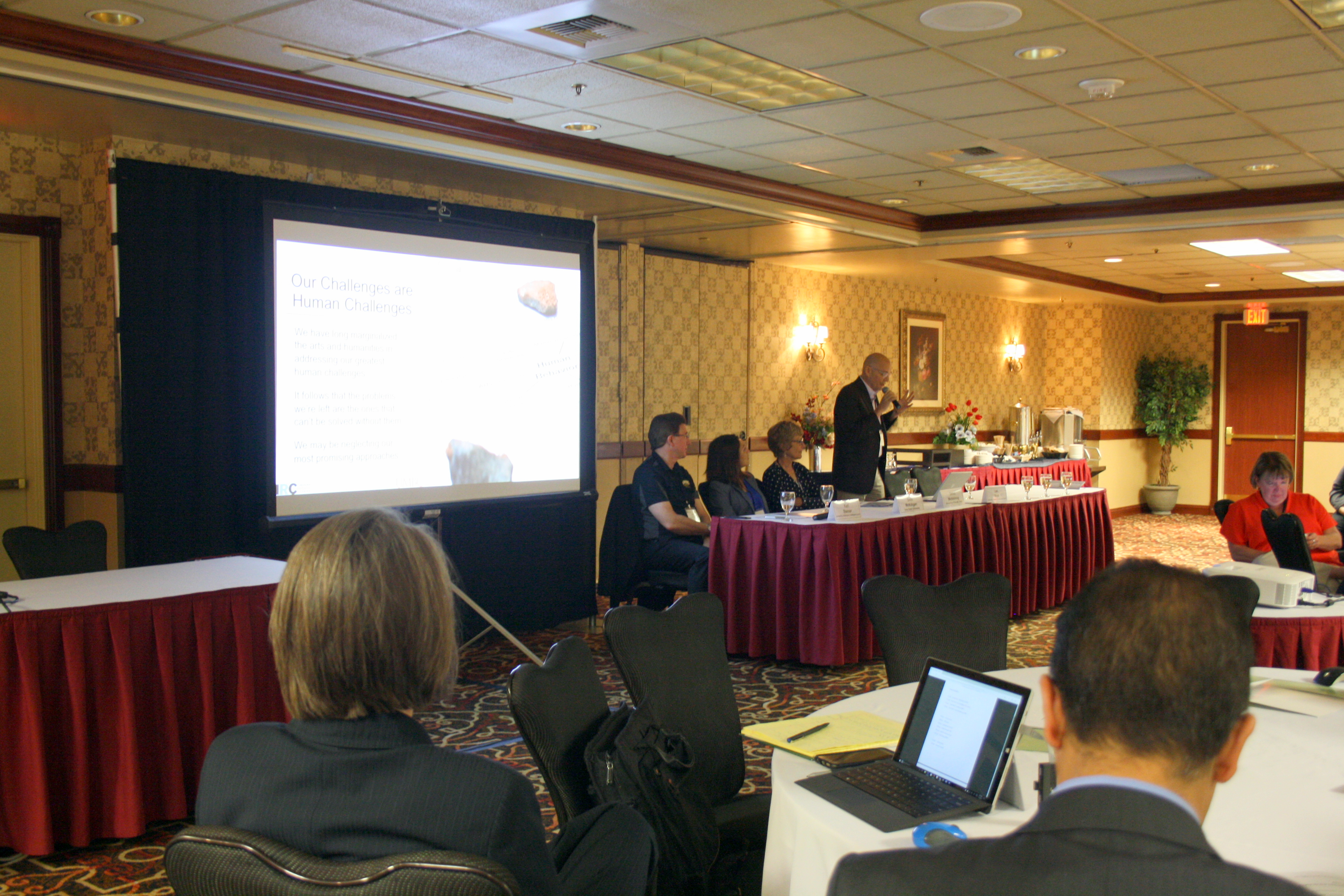 Lee Boot speaks in "Bridging the Cultural Divide: Bringing the Arts, Humanities, and Sciences Together." Front table, left to right: Karl Steiner, Seda McKilligan, Debra Moddelmog, Lee Boot. Photo credit: Sarah Rovito