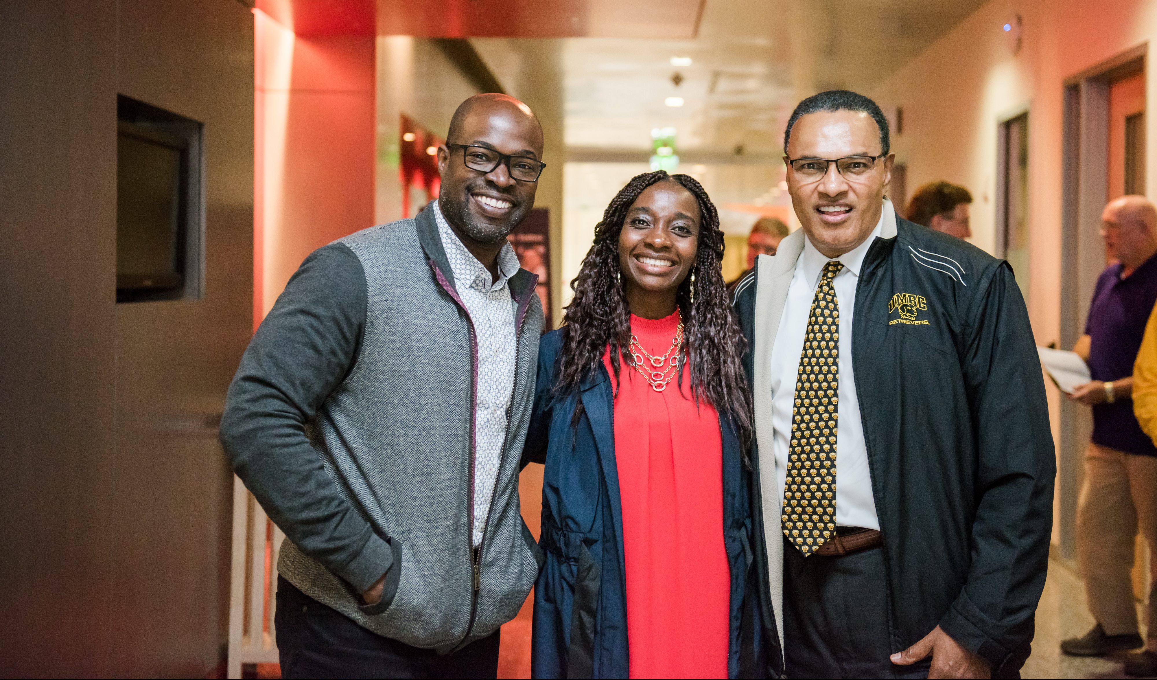Kafui Dzirasa ’01 (left), Gymama Slaughter (center), and President Freeman Hrabowski at the GRIT-X event.