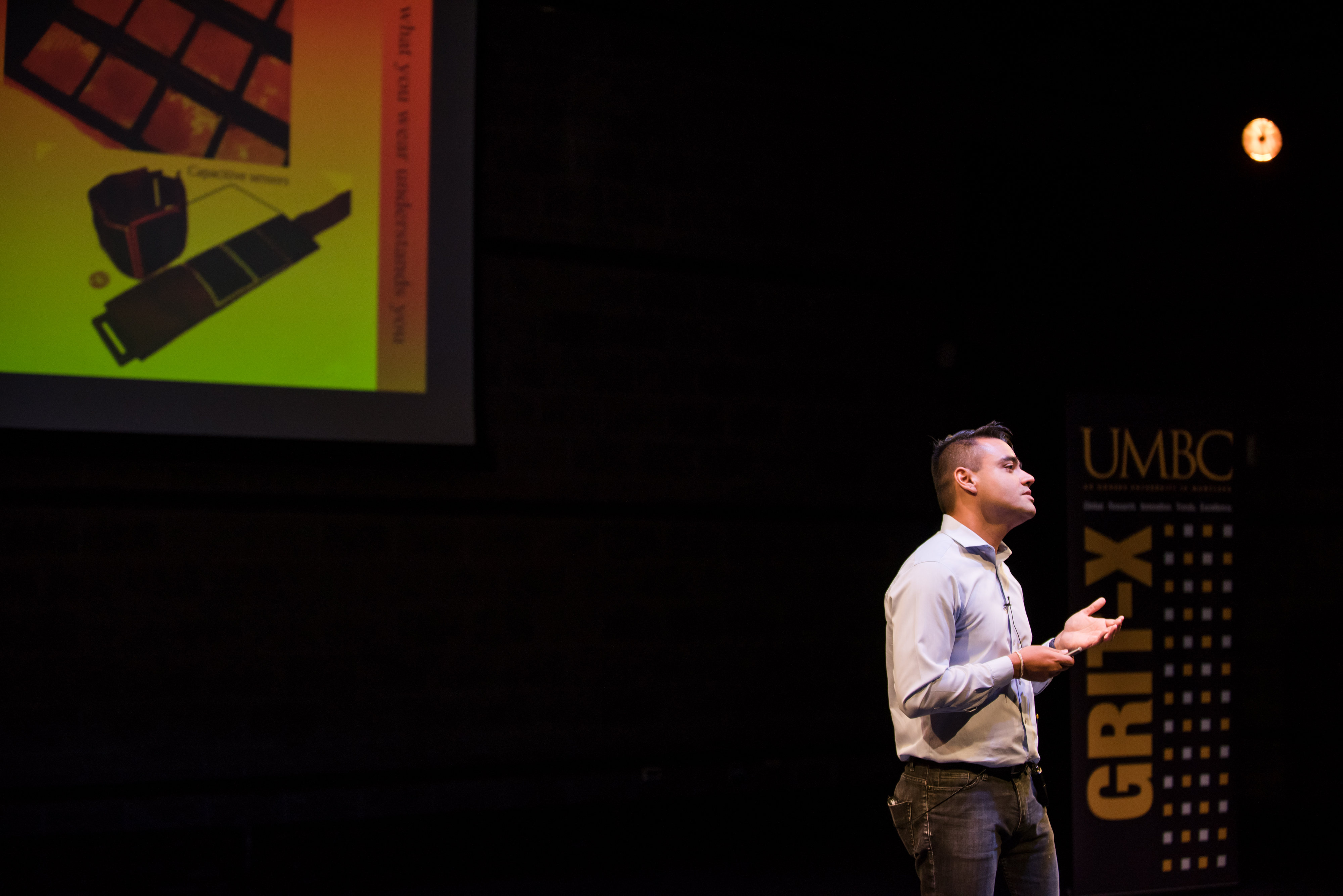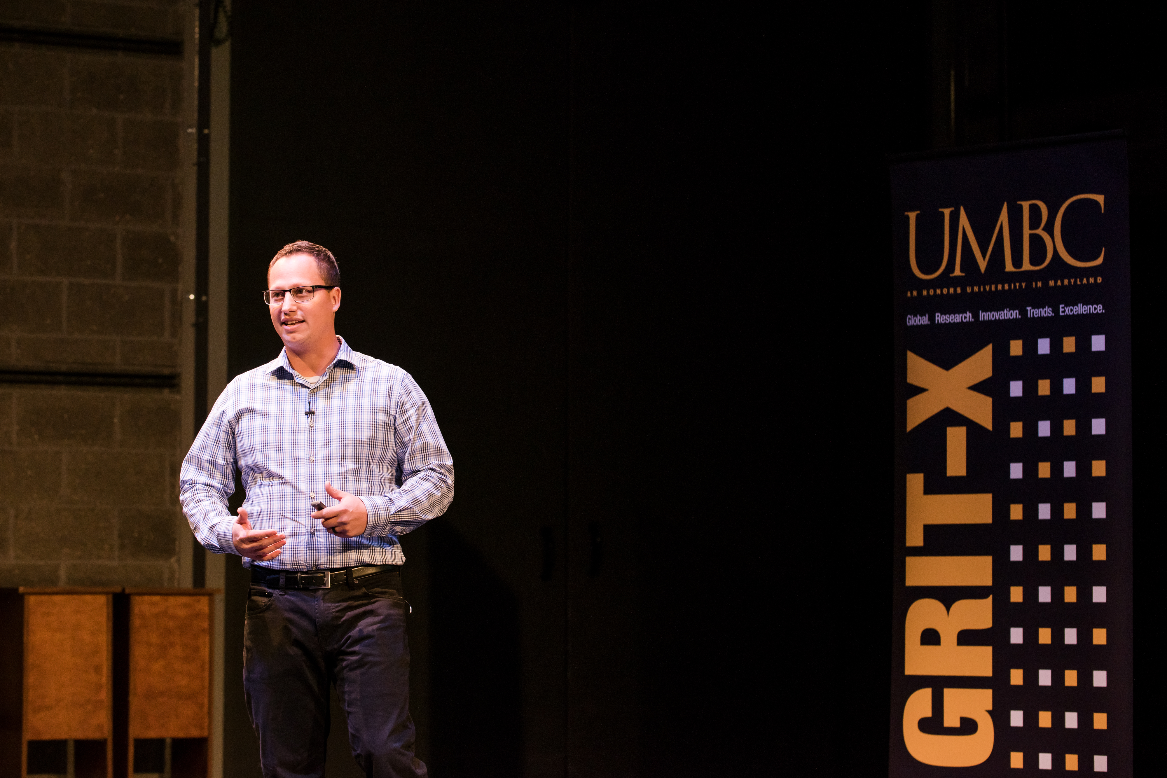 Nine distinguished faculty and alumni shared their stories at GRIT-X, a TED talk-style event during UMBC’s Homecoming. Karl Steiner, UMBC vice president for research, introduced the event, which debuted at last year’s 50th anniversary celebration. “We’ll take you from outer space to inner space,” he said, “from black holes in the universe to a pacemaker for the brain.”