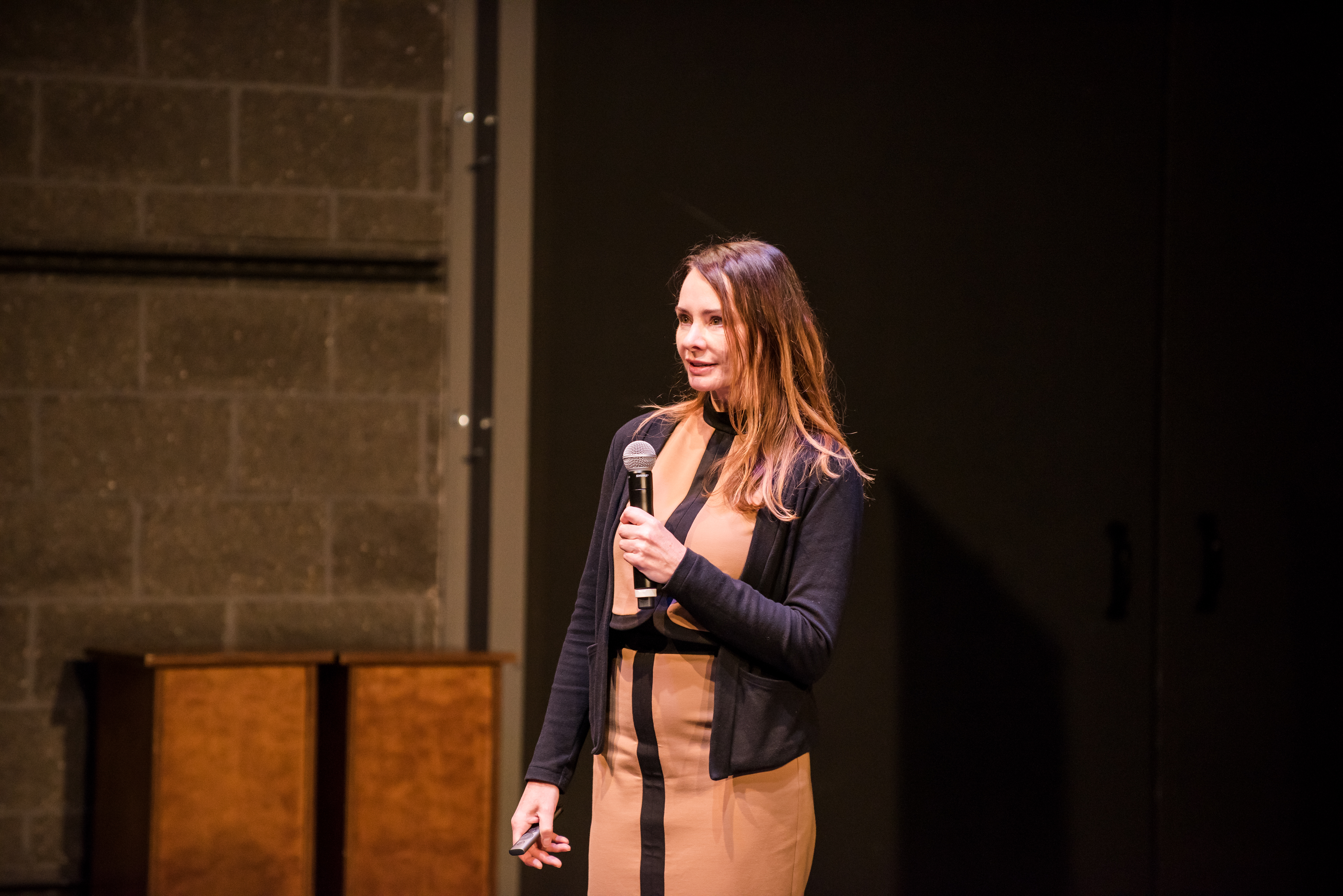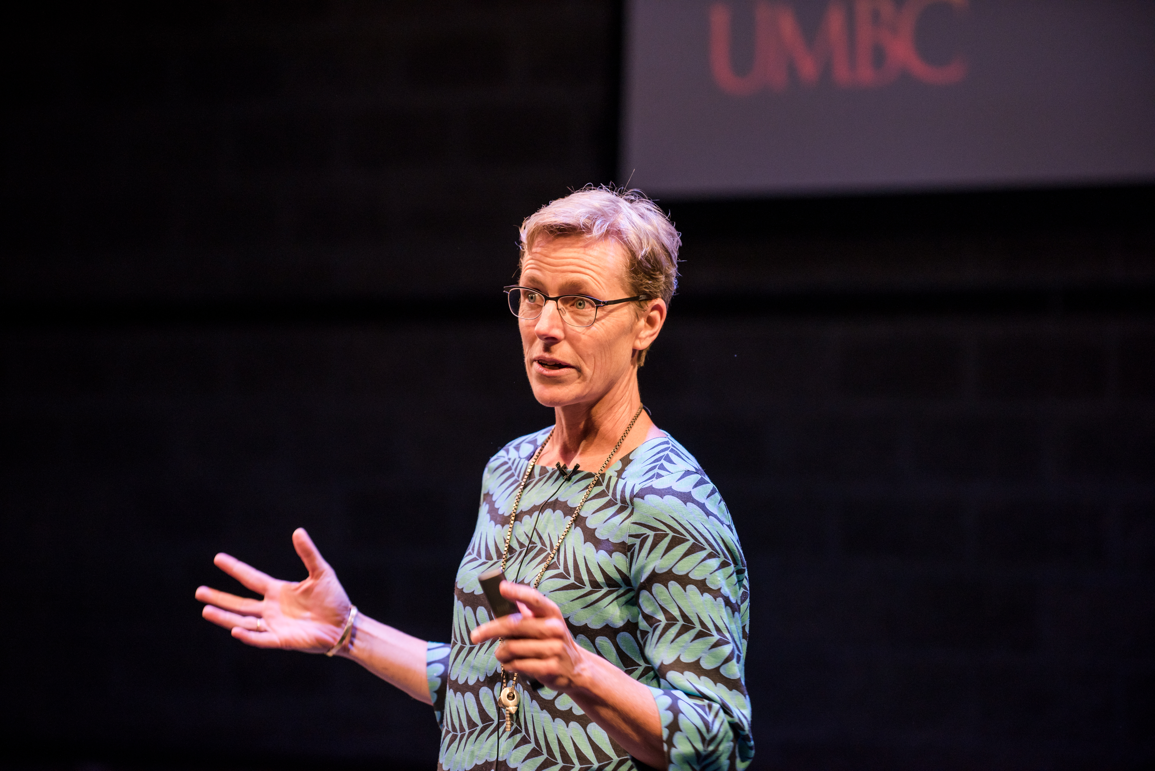 Finally, Doug Hamby, associate professor of dance, and two UMBC dance students, Emily Godfrey ’20 and Samantha Siegel ’18, created an original dance right before the audience’s eyes. Hamby gave them instructions and they absorbed them on the spot, performing turns, rolls, and pliés to the audience’s delight. “When I make a dance,” Hamby shared as he moved fluidly across the stage, “I like to think of it as an investigation of the human body in motion, and in space, and in time.”