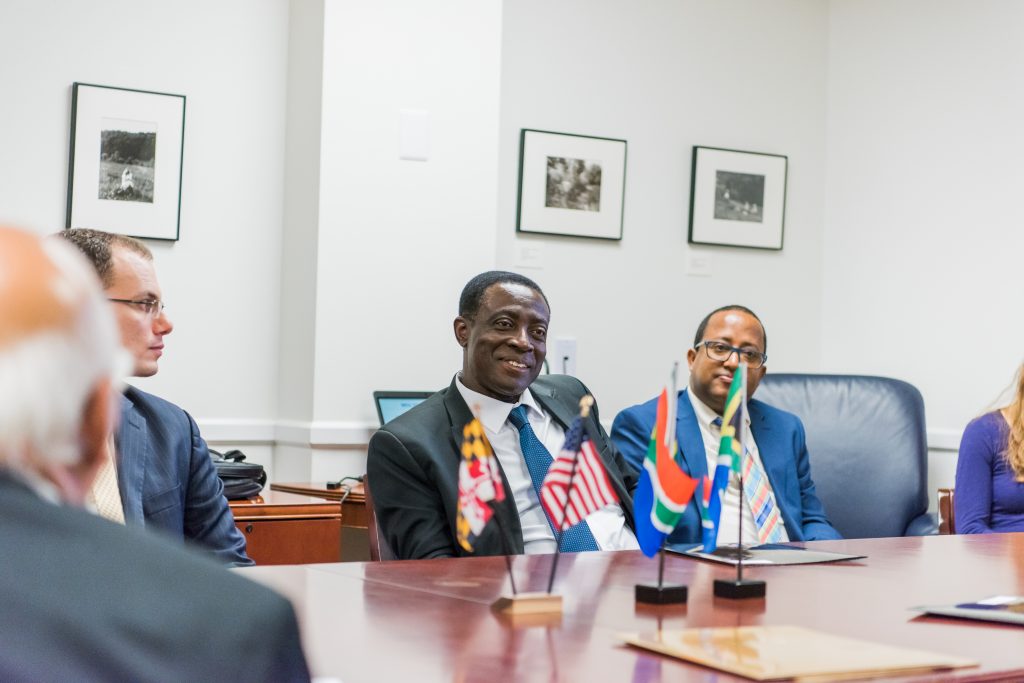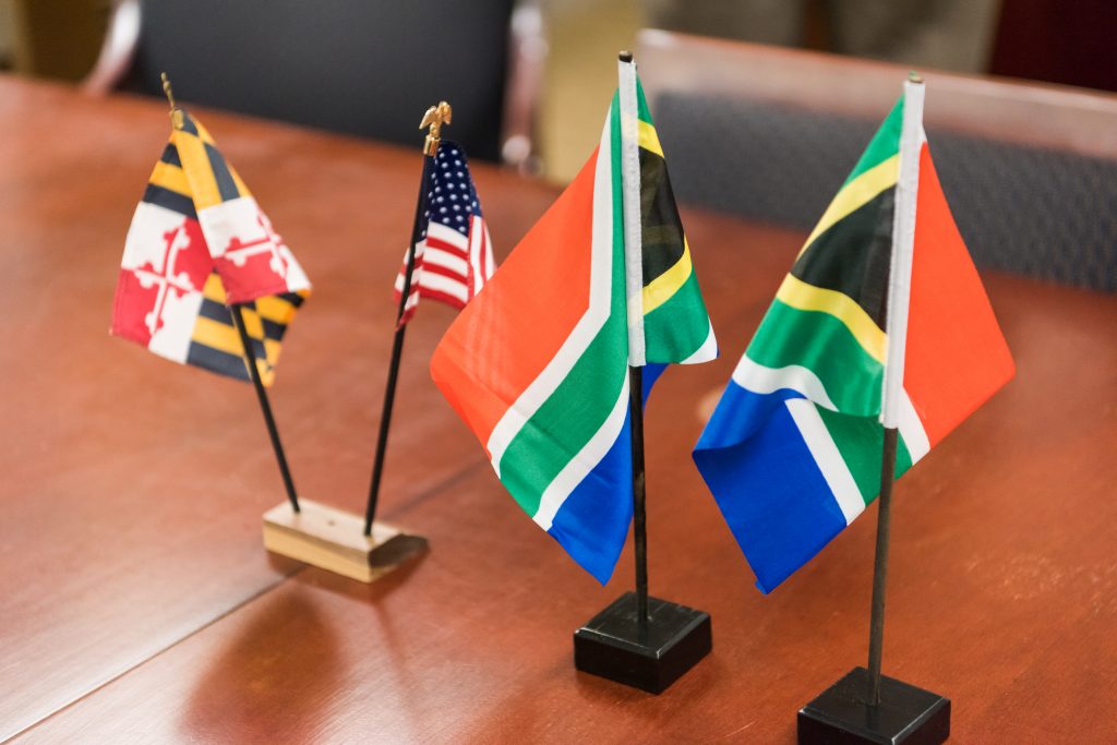 Maryland, U.S., and South African flags adorn the conference table at the partnership event.