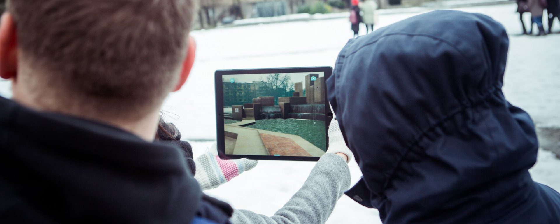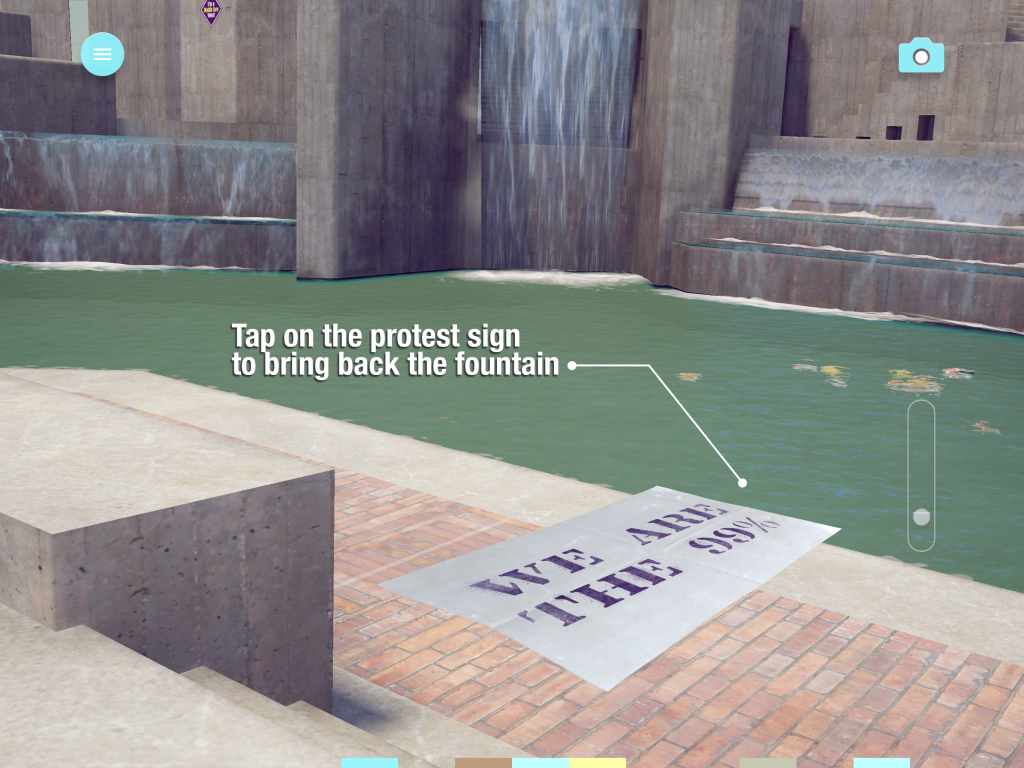 The app, which is available for both iOS and Android devices, projects a full-scale 3D image of McKeldin Fountain onto tablet or smartphone screens, creating the illusion that the fountain is present in the surrounding environment. The fountain’s history is told through various interactive “memory artifacts,” such as koi fish and protest signs, which when clicked will show interviews with Baltimore residents sharing their memories of events at McKeldin Square. The app can be downloaded for free and used anywhere in the world, but its effects are best realized when used on McKeldin Square where the fountain once stood.