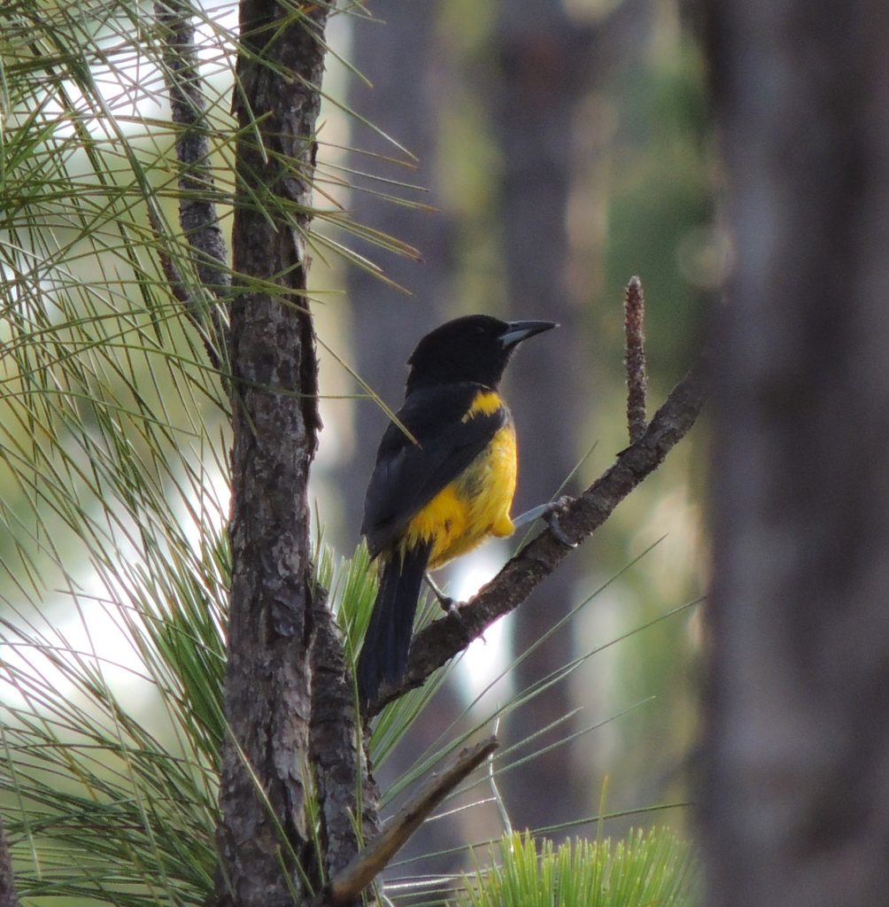 A Bahama Oriole on a pine branch. UMBC undergrads were the first to discover the species nesting in the pine forest, suggesting they may have more habitat remaining than previously understood. Photo by Matthew Kane ’19.