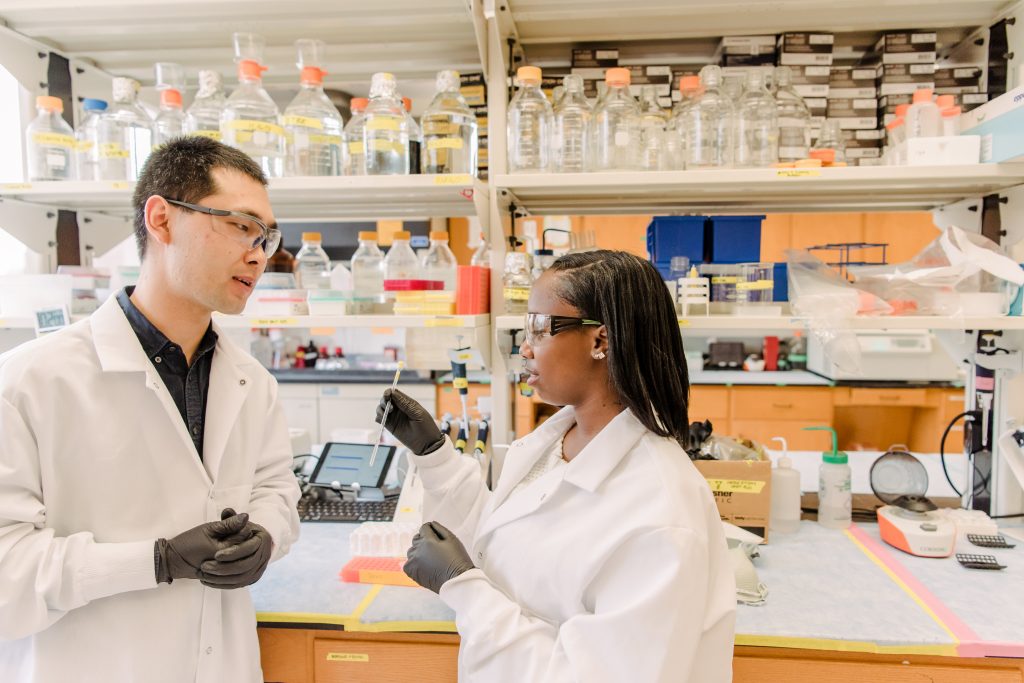 Alexis Waller ’18, right, and her mentor Pengfei Ding at work in Michael Summers’s biochemistry lab. Photo by Marlayna Demond ’11 for UMBC.
