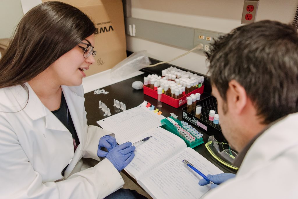 Abby Cruz ’18, left, and her mentor Fernando Vonhoff discuss an experimental protocol. Photo by Marlayna Demond ’11 for UMBC.