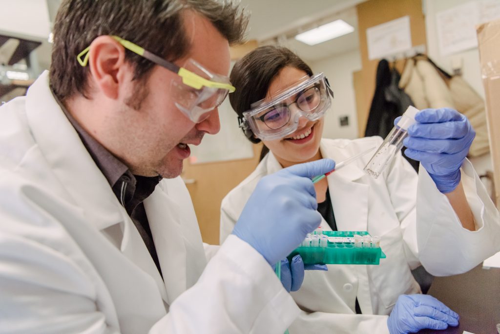 Abby Cruz ’18 and her mentor Fernando Vonhoff check on a vial of fruit flies, their study organism. Photo by Marlayna Demond ’11 for UMBC.