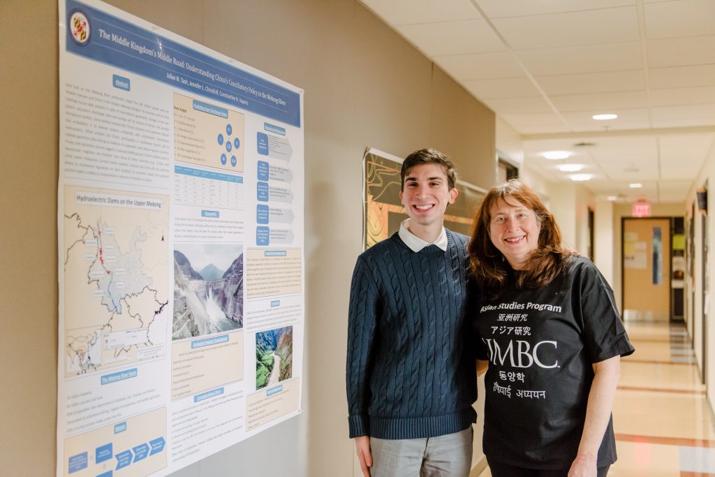 Julian Tash ’18 and one of his mentors, Julie Rosenthal, stand by his research poster about dam removals on the Mekong River in China. Photo by Marlayna Demond ’11 for UMBC.