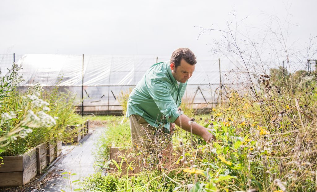 Chris Swan checks on plants at the UMBC greenhouses for use in restoration projects. Photo by Marlayna Demond ’11 for UMBC.