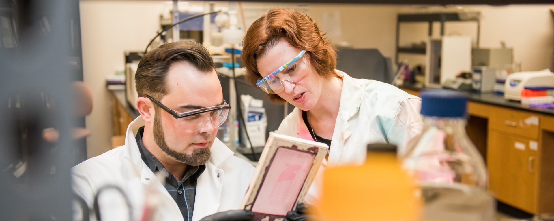 Featured photo: Chemical and biochemical engineering Ph.D. student Adam Day (left) works with Prof. Erin Lavik (right) in her lab, which focuses on polymer synthesis and processing, drug delivery, and stem cell biology to create new therapies. All photos by Marlayna Demond ’11 for UMBC.