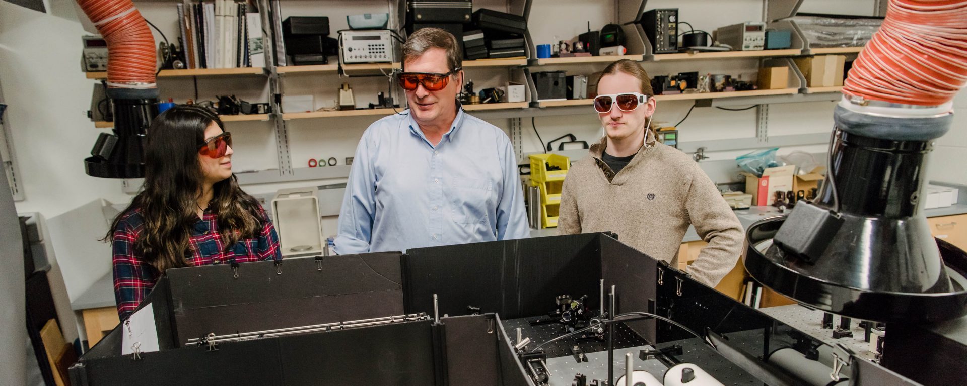 Brad Arnold (center) examines the laser setup with Sara Tahir ’21, biochemistry, and Eric Bowman (right), Ph.D. student in chemistry.