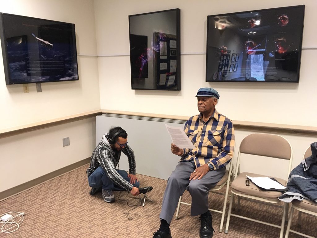Pineda recording audio for interactive exhibit at the museum.