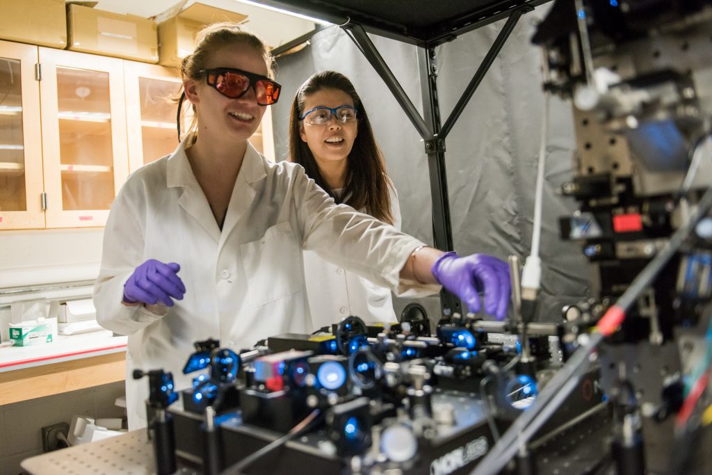 Minjoung Kyoung and Erin Kennedy work on the lab’s unique microscope. Photo by Marlayna Demond ’11 for UMBC.