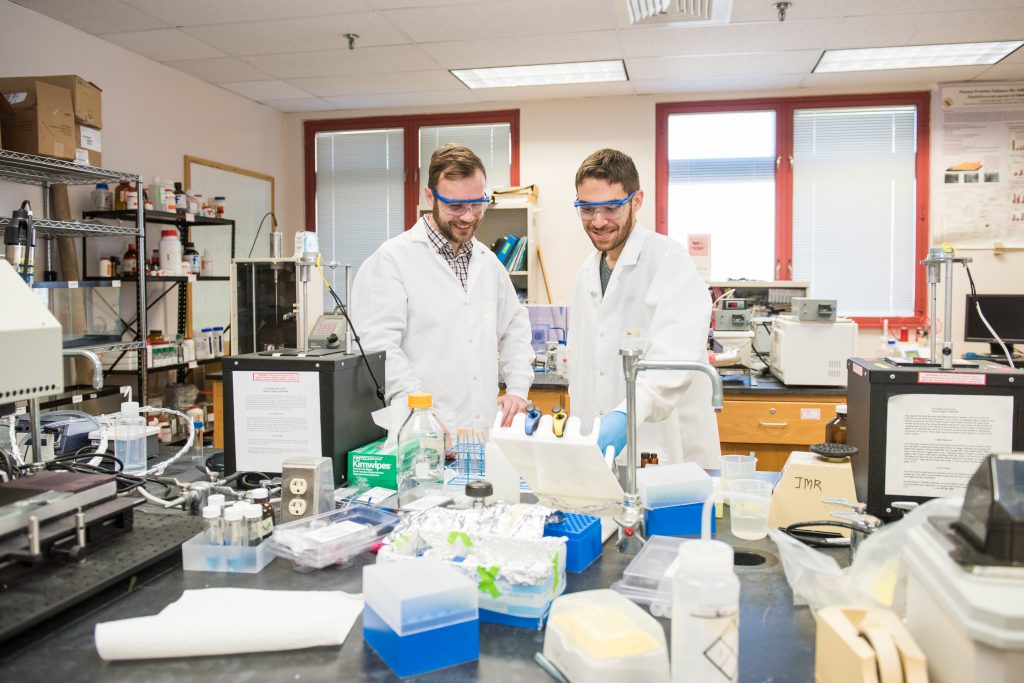 Lee Blaney and Daniel Ocasio ’17, chemical engineering, working in UMBC’s Engineering Building.