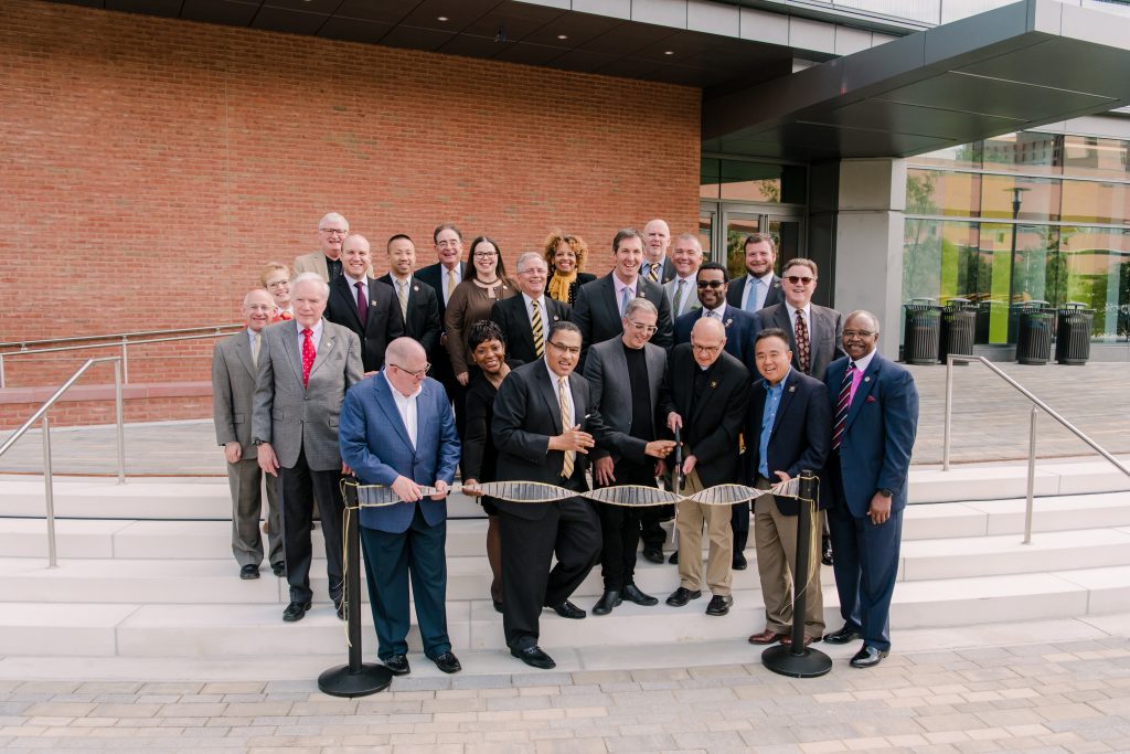 During the height of UMBC Homecoming festivities on October 12, the university community and supporters from across Maryland gathered to celebrate the opening of UMBC’s Interdisciplinary Life Sciences Building (ILSB). “With the addition of this incredible, world-class facility, the state of Maryland will continue to lead the way,” Governor Larry Hogan told the crowd, speaking from behind a festive ribbon twisted in the form of a double helix . “And UMBC will continue to push the boundaries, achieve significant breakthroughs, and shine as a national and global leader in innovation.”