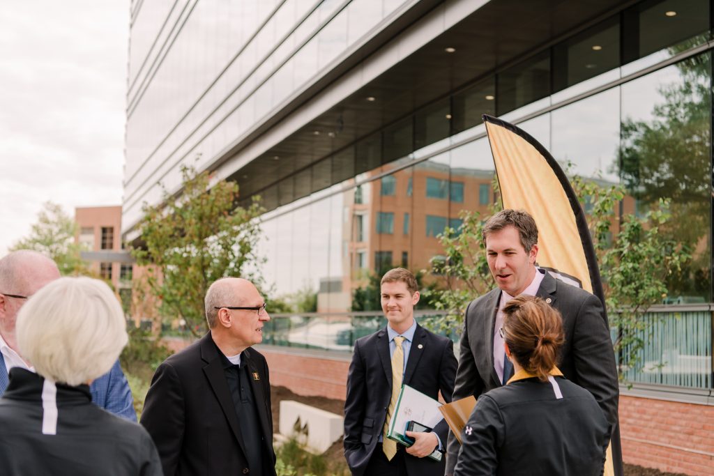 John Olszewski, Ph.D. ’17, (right) chats with Dean Bill LaCourse (left) and other attendees outside the ILSB before the ribbon-cutting ceremony.