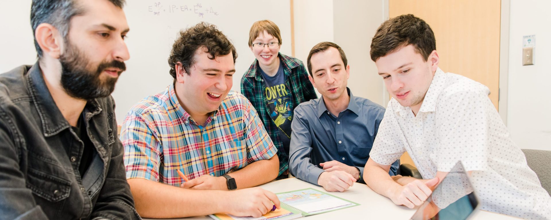 Header image: Daniel Wines (far right), Jaron Kropp (second from right), Can Ataca (second from left) and other lab members meet. Photo by Marlayna Demond ’11 for UMBC.
