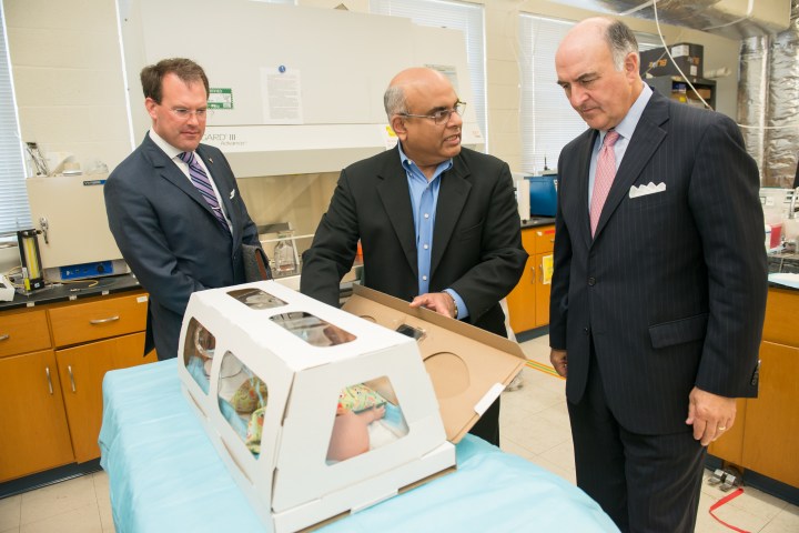 Govind Rao, center, presents a prototype incubator to then-Maryland Secretary of Commerce Mike Gill in 2017. Photo by Marlayna Demond ’11 for UMBC.