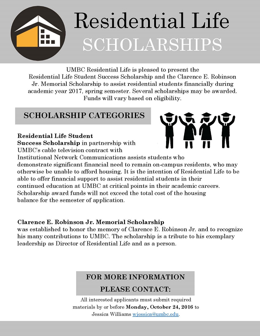 UMBC Residential Life is pleased to present the Residential Life Student Success Scholarship and the Clarence E. Robinson Jr. Memorial Scholarship to assist students financially during academic year 2017, spring semester.