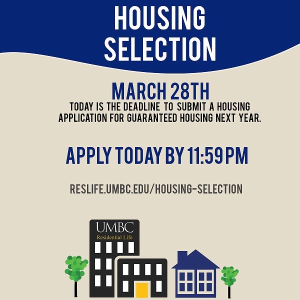 Today is the deadline to submit a housing application for guaranteed housing next year. You need to have submitted a housing application from your Residence account (can be reached via the Residential Life website: www.umbc.edu/reslife) by 11:59 PM TONIGHT (March 28, 2017)