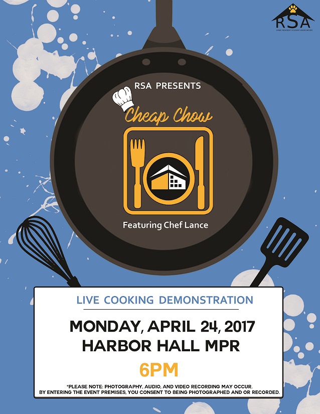 Meet him, greet him and be sure to take a pic and post on Reslife's FB page. Cheap Chow's own Chef Lance will provide some simple recipes; easy to prepare and great to eat.