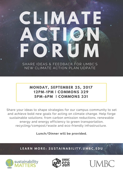 Mark your calendar, Monday, September 25, 2017 Share your ideas to shape strategies for our campus community to set and achieve bold new goals for acting on climate change. Help forge sustainable solutions; from carbon emission reductions, renewable energy and energy efficiency to green transportation, recycling/compost/waste and eco-friendly infrastructure.