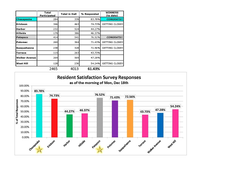 Congratulations to Chesapeake Hall and Patapsco Hall for reaching the goal of 75% resident participation.