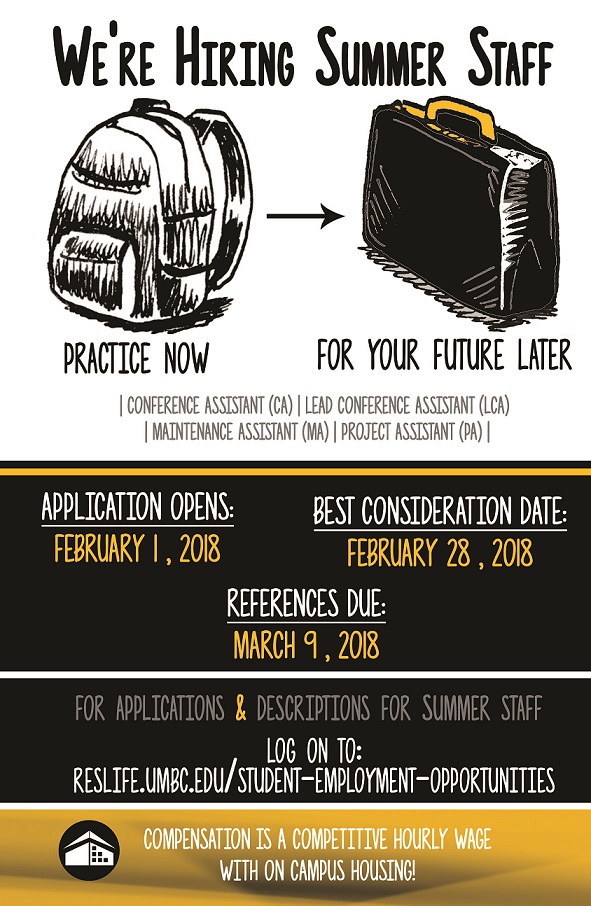 Summer Applications are now open, https://reslife.umbc.edu/student-employment-opportunities/
