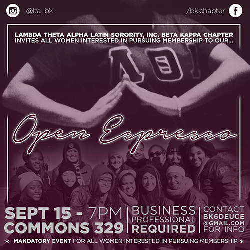 Beta Kappa chapter invites ALL interested UMBC women to our Open Espresso of the semester TUESDAY, SEPTEMBER 15TH (7-9pm) Math/Psych 103, to learn more about joining our beautiful sisterhood. Lambda Theta Alpha is a family that lives by the principles Unity, Love, and Respect everyday through academic achievement, professionalism, philanthropy, community service, and cultural awareness. We strive to empower the Universal Woman by being a non-exclusive organization that embodies diversity of race, ethnicity, creed, sexual orientation, and financial status. We're the FIRST and LARGEST sorority of our kind, with our sisterhood spanning over 150 chapters nationwide. Create a new chapter in your life and join ours!