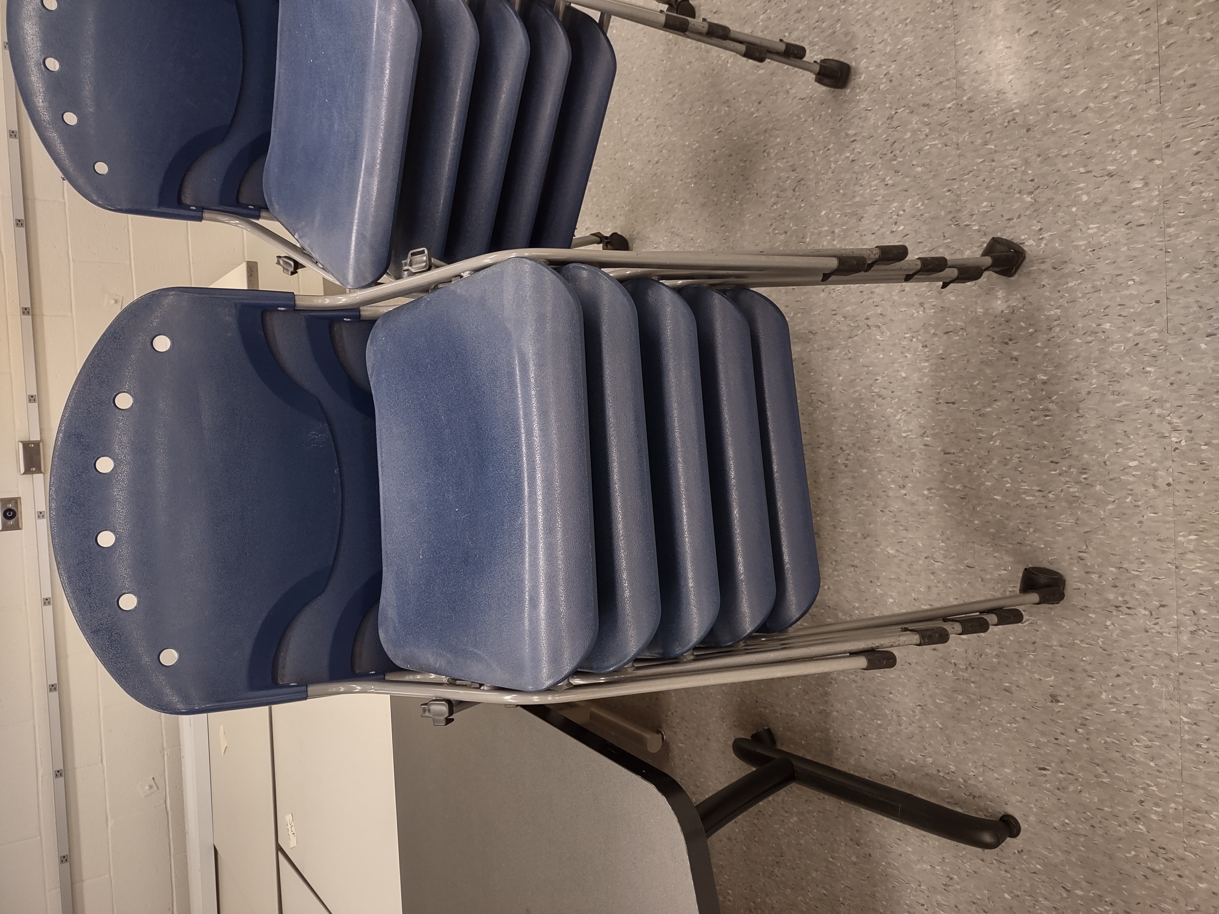I had 25 Blue Plastic Stacking Chairs that I no longer need in the department. A few have casters, but most have plastic feet. Email ejcrowe@umbc.edu to come over and check them out. They are located in the Physics Building.