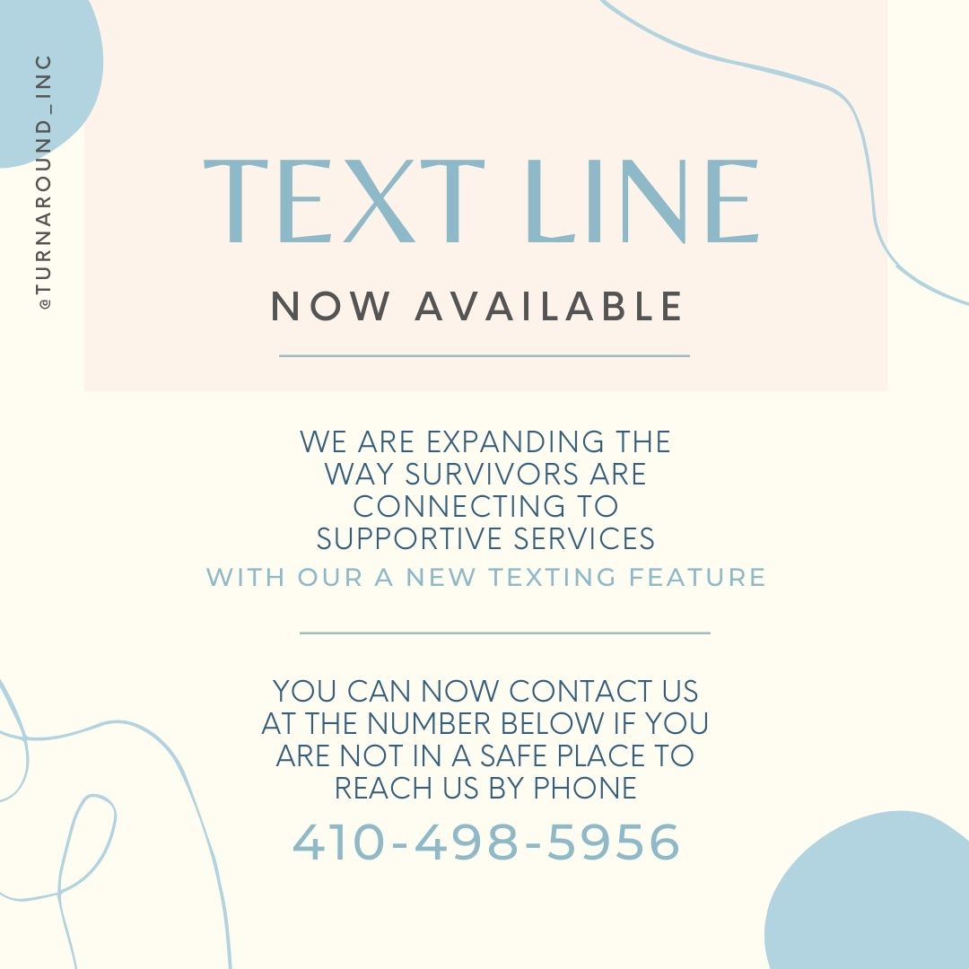 For those who need TurnAround's help but are not able to call their helpline or office can now text their incredible Crisis Response Team at 410-498-5956 for 24/7 emergency support!