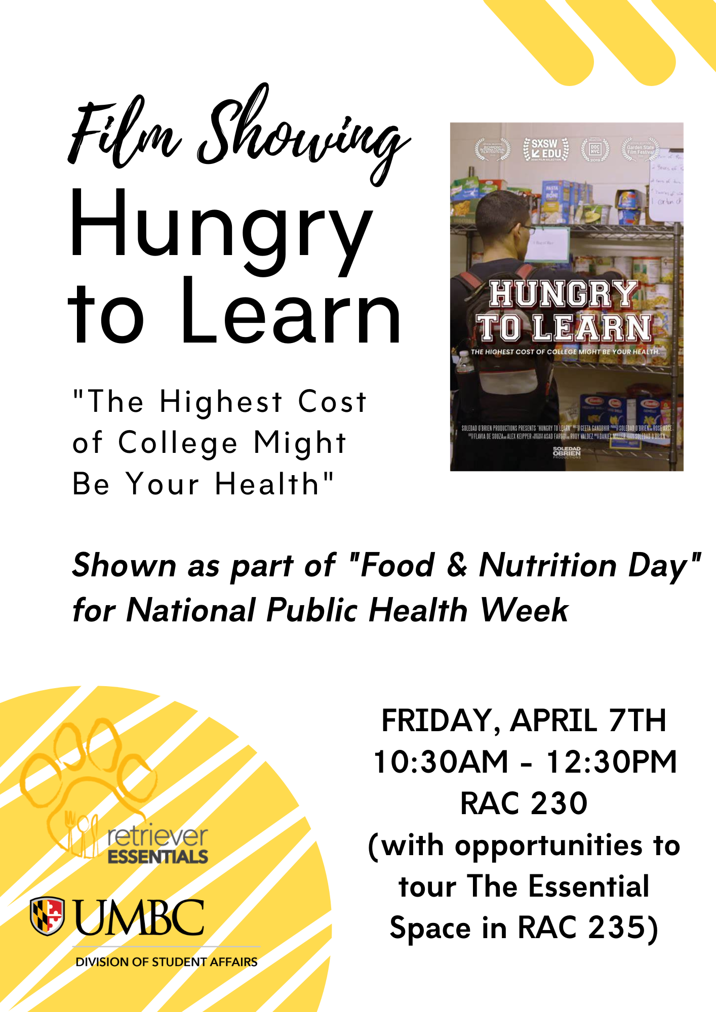 Retriever Essentials is teaming up with National Public Health Week to show the film "Hungry to Learn" TODAY in RAC 230 from 10:30am to 12:30pm. Please join us if you can & bring a friend or colleague. This film is about the American crisis of food insecurity on college campuses, a greater trend which the UMBC community is experiencing too. View the trailer here. You are also welcome to walk through UMBC's Free Grocery Store, The Essential Space (RAC 235) this morning too.