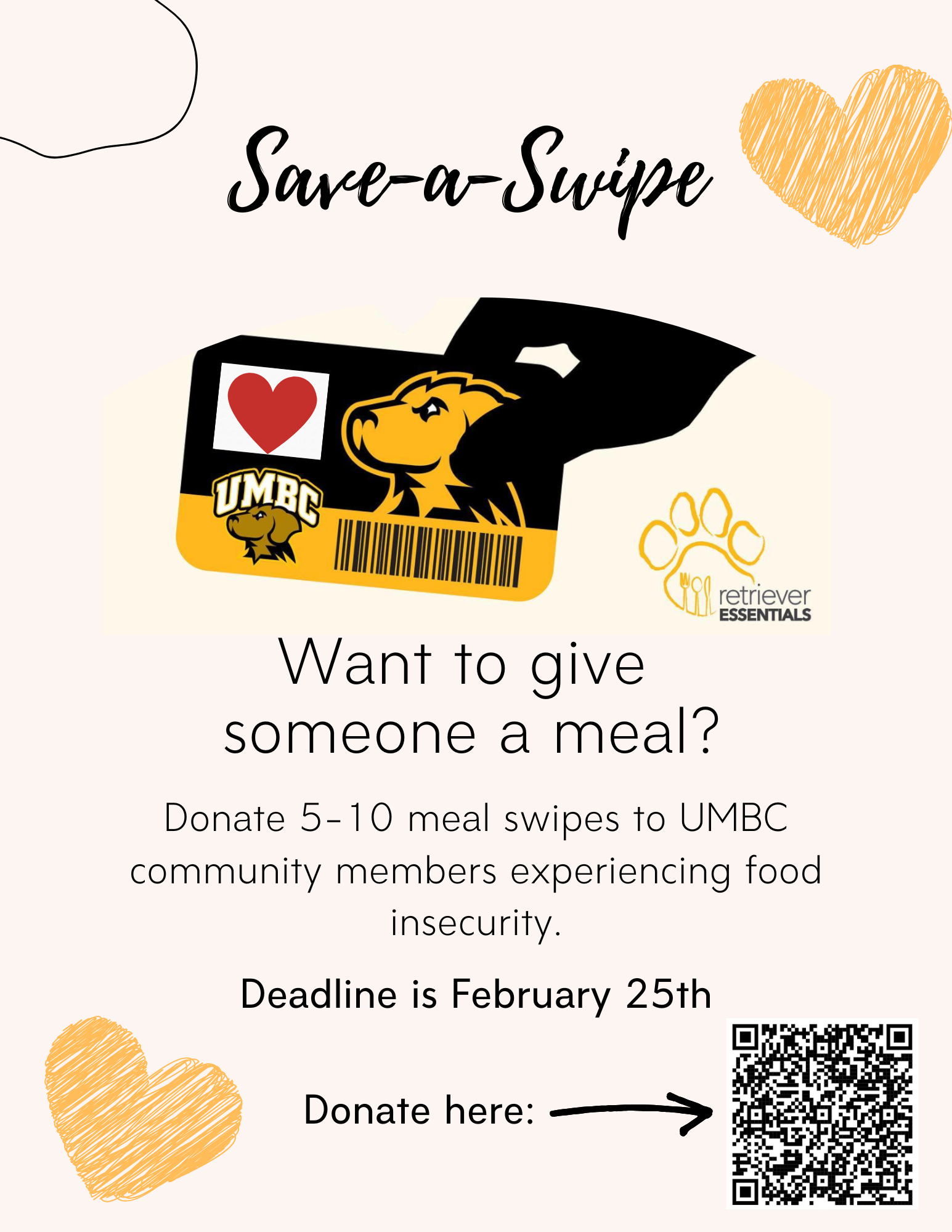 Or click this link to donate: Save a Swipe - Retriever EssentialsEach donated swipe will directly contribute to providing one "meal" to students in need. The deadline to donate is February 25th. Thank you for considering this request and we appreciate your support in helping us combat food insecurity at UMBC!
