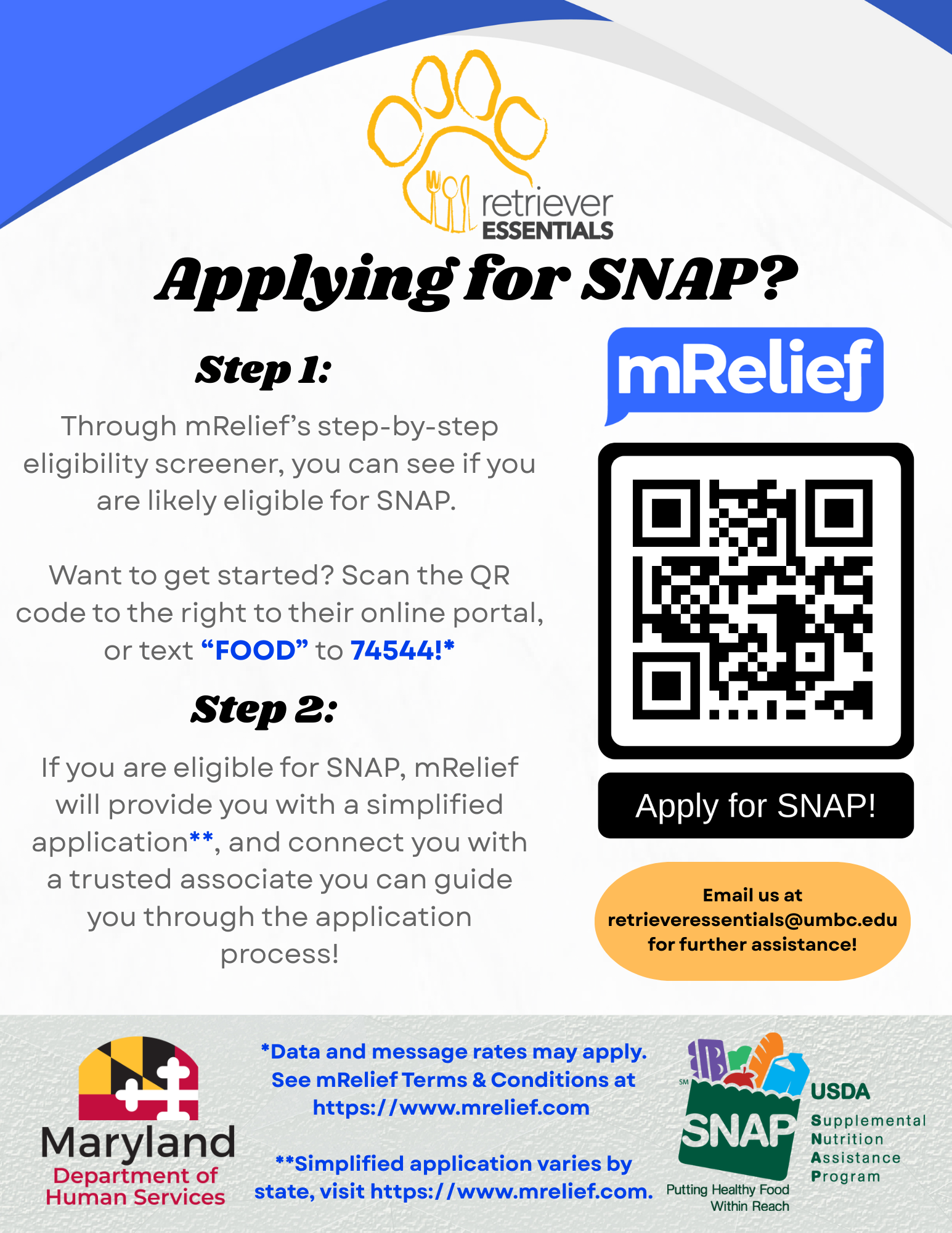 We at Retriever Essentials are happy to say that we are working with mRelief, a program that helps students have better accessibility to SNAP benefits! mRelief provides a step-by-step process to help you apply for SNAP benefits, and see if you are likely eligible to receive aid!