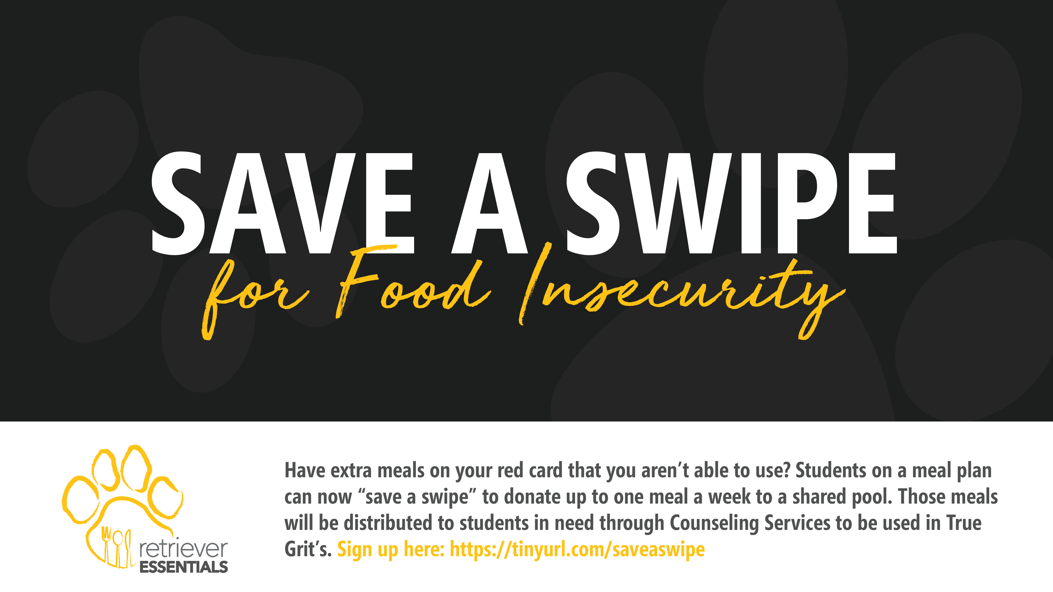 A partnership between Retriever Essentials, Chartwells, and Campus Card allows you to donate some swipes from your meal plan to an anonymous pool that can be used by students identifying as food insecure so they don't go hungry on campus!
