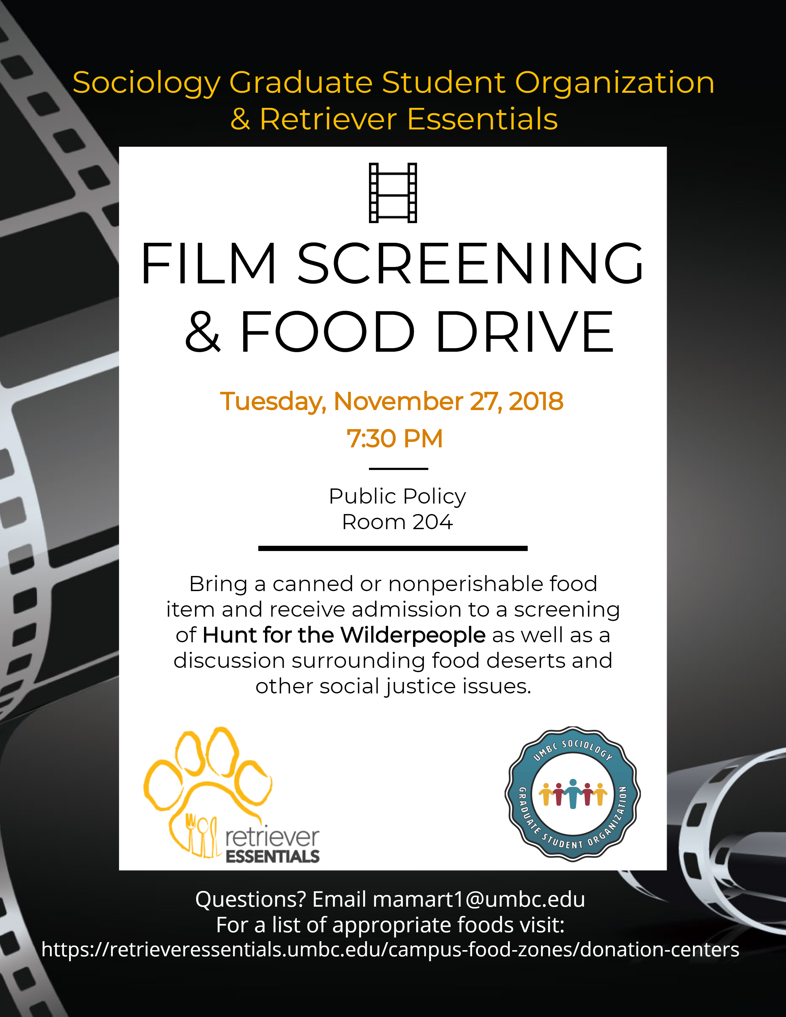 The Sociology Graduate Student Organization will be hosting a free screening of Hunt for the Wilderpeople on 11/27. Retriever Essentials is partnering with them and will be collecting donations at the event.