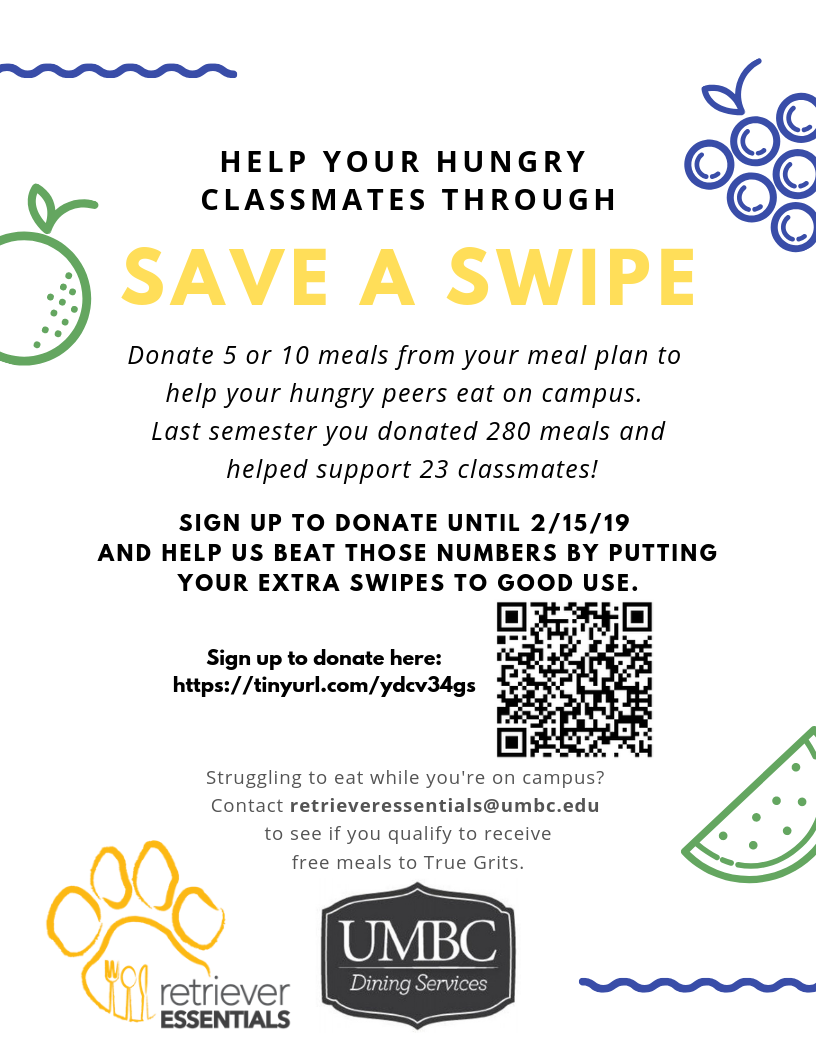 The Save a Swipe Program provides free meals to True Grits for students who have been identified as food insecure by trained staff. Are you struggling to eat while you're on campus? Email retrieveressentials@umbc.edu to see if you qualify.