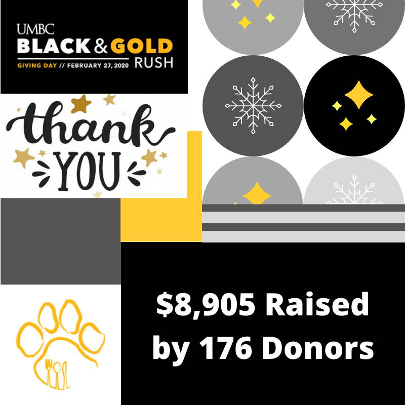 Once again, our kind and caring UMBC community came forward to support struggling students in need of food. Thank you for helping us to help our students succeed in their studies and to (hopefully) graduate with a degree so that they will never be hungry or homeless again!! - Julie Rosenthal - Program Management Specialist This was my first giving day at UMBC and I was so impressed with the generosity of our community! I’m so thankful that so many people believed enough in our mission and our work that they chose to donate to retriever essentials. I know that their support will help us to improve food access at UMBC! - Ryan Kmetz - Assistant Director of Sustainability Thank you UMBC community for all the donations. Giving day to me means we are taking steps away from hunger & suffering and steps towards a world with communities that take active action to show care rather than just speaking care into existence. - Jada Washington - Health Administration and Policy Program Intern UMBC Giving Day has become a true representation of the kindness and care we witness each day through the generous donations from the community. We all stand together in the mission to achieve basic need security for all. And on February 27th, the campus demonstrated just that. – Fariha Khalid – CCMA AmeriCorps VISTA/Program Coordinator