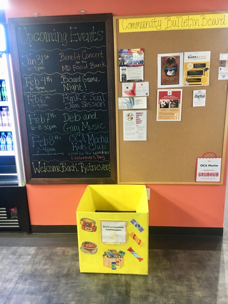 You can drop your donations at the Campus Police Office or OCA Mocha (5410 East Drive, Arbutus, MD 21227). Please visit OCA Mocha’s website to check the up-to-date operation hours. When you arrive at the Campus Police Station or OCA Mocha, you can use these Retriever Essentials donation boxes to drop-off your donations (see pictures below).