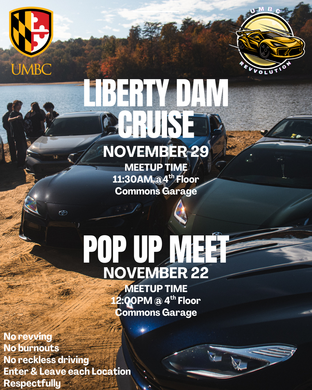 Due to the weather we will now be having the Liberty Dam cruise on Saturday the 29th. Additionally, instead of cruising on the 22nd, we'll be hosting a pop up meet in its place! Come chill with us in the 4th floor of the Commons Garage at 12PM Saturday the 22nd, and we hope to see y'all next week for the cruise!