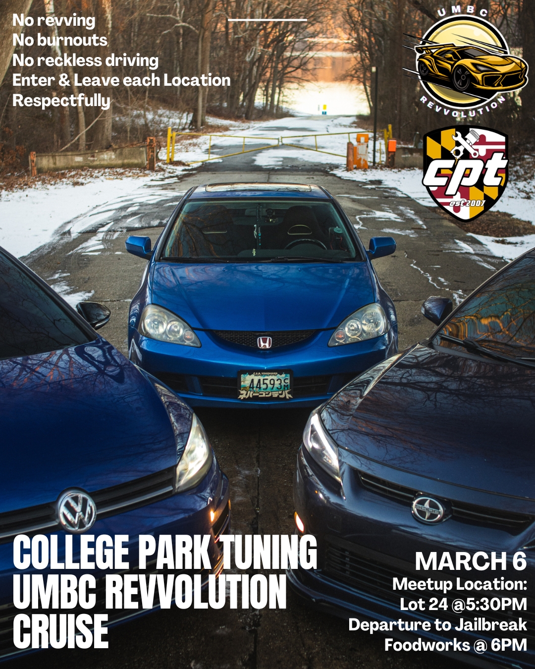 Join us and College Park Tuning on Friday March 6th for a cruise! We'll be starting at our campus, and making our way to Jailbreak Foodworks to meet with College Park Tuning's crew! The details are listed below, and we hope to see y'all there!