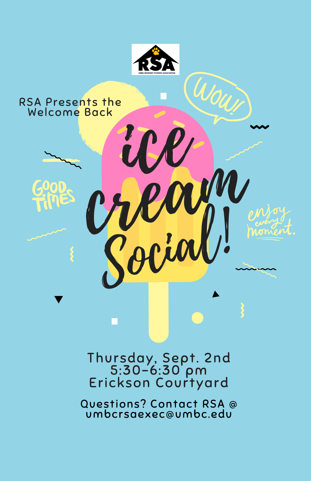 Welcome (or welcome back) Home Retrievers! We are so excited to kick off the start of the new school year with you on Thursday, September 2nd! Head over to Erickson Courtyard for an evening of FREE ice cream and conversation hosted by Resident Student Association starting at 5:30pm. This ice cream social is a great way to make new friends, form new connections while enjoying some ice cream and learn more information about RSA, Community Council, and how to get involved! Non-dairy novelty options will be offered as well!