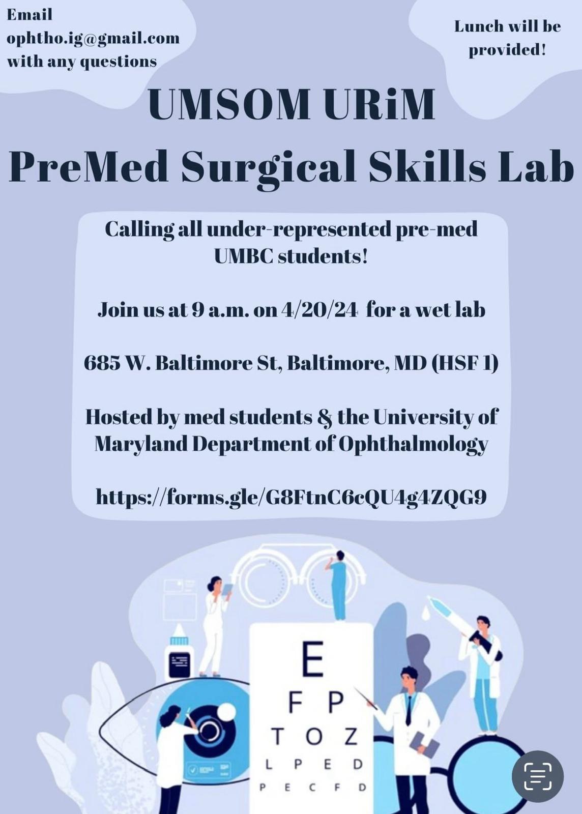 There is an opportunity for interested underrepresented Pre-Med students to attend a microsurgical workshop at the University of Maryland School of Medicine in the Department of Ophthalmology, which will feature surgical skills stations, a Q&A, as well as a tour of the UMSOM campus.