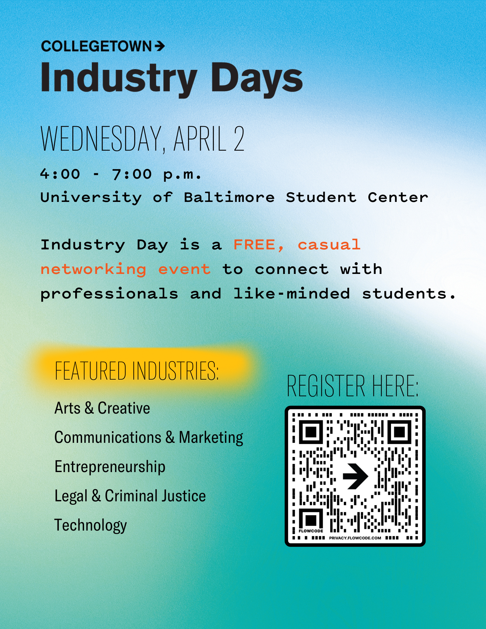 Held at the University of Baltimore, the Collegetown Network is hosting "Industry Days" on Wednesday, April 2 from 4-7pm. It's a free, casual networking event to connect with other students and professionals from a variety of industries. Open to all members of the UMBC community.