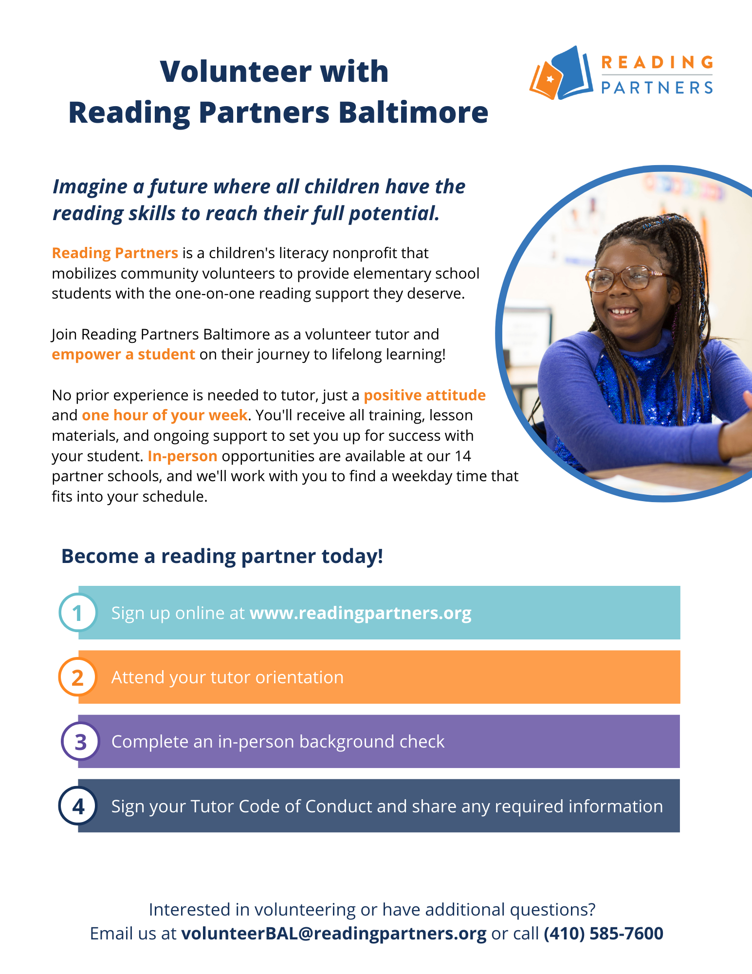 Interested in supporting your community? Please consider this opportunity with the Baltimore chapter of Reading Partners, a national organization that provides 1:1 tutoring sessions to youth that promote literacy.