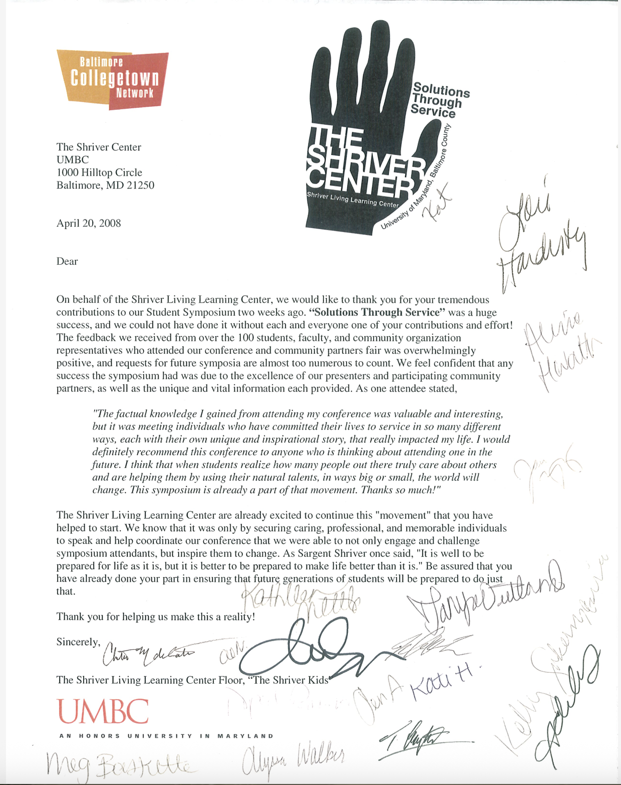 Back in the 90's, The Shriver Center at UMBC led a Consortium of local colleges and universities through a Learn and Service America grant, which included activities like the "Solutions in Service" conference. The following decade, thanks to funding from UMBC's then-Dean of Undergraduate Education, Dr. Diane Lee, the Shriver LLC took lessons from the 90's community-building playbook and planned and implemented this 2008 event (the our "thank you" letter template is below). Friend and colleague Anthony Butler from The University of Baltimore kept the energy flowing and hosted the 2009 event....and the rest is history.