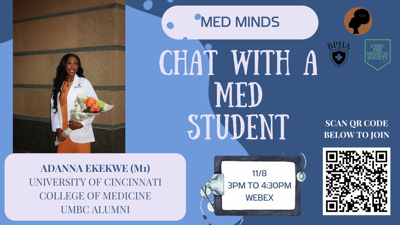 On November 8th from 3pm-4:30pm on Webex, we have an exciting event with our guest speaker Adanna E. She was a former UMBC alumni and is currently in her first year of medical school! She will be coming to talk about her journey as a premed and as an applicant as well! Show up for some insightful and valuable advice!