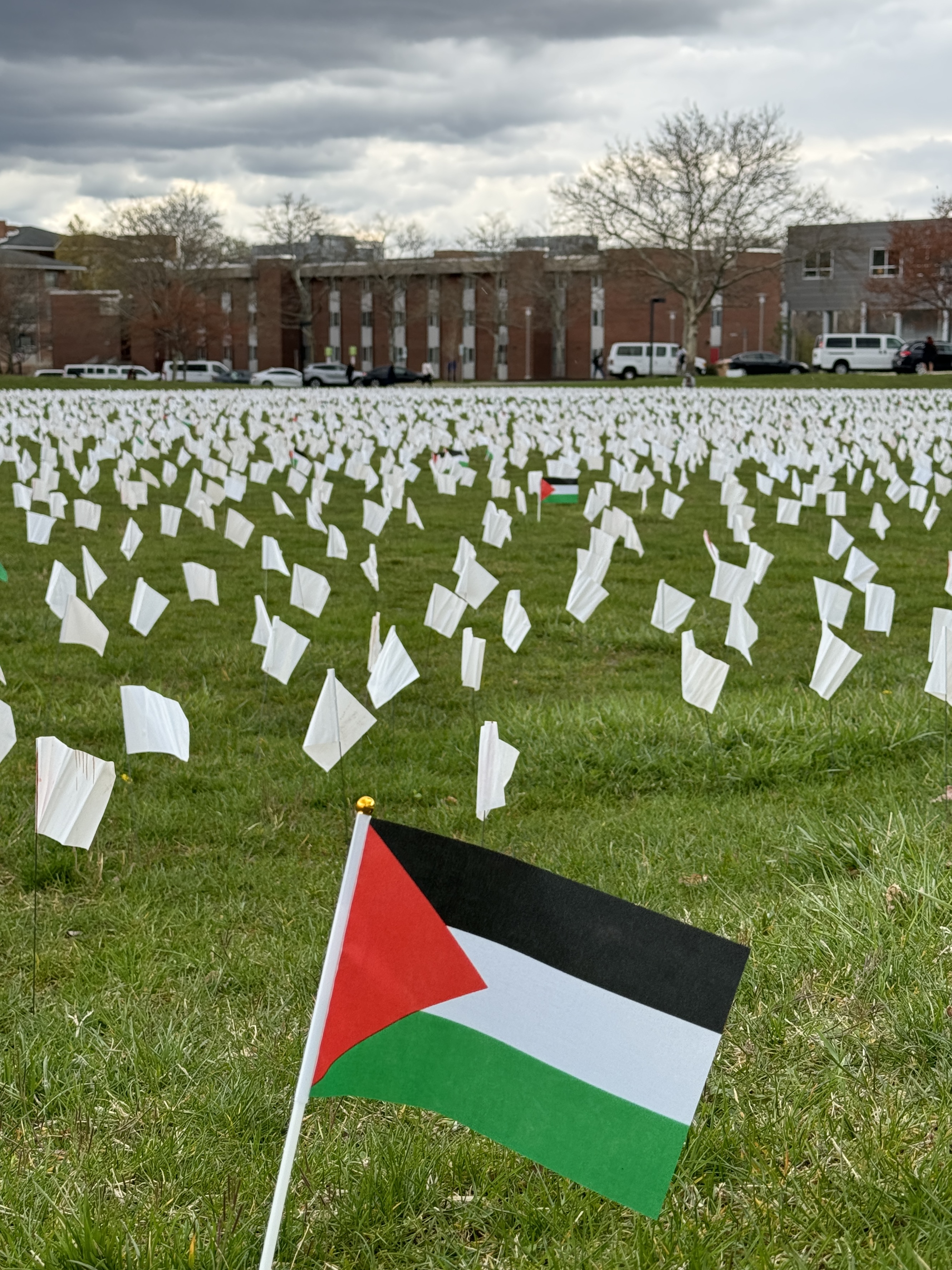 The death toll in Gaza continues to rise past 30,000 everyday with the bombing of schools, hospitals, and refugee camps. Occupation forces are indiscriminately murdering women, children, journalists, aid workers, and innocent civilians. Each of the 15,000 flags we displayed on Erickson field represents more than 2 Palestinians killed in the ongoing genocide.